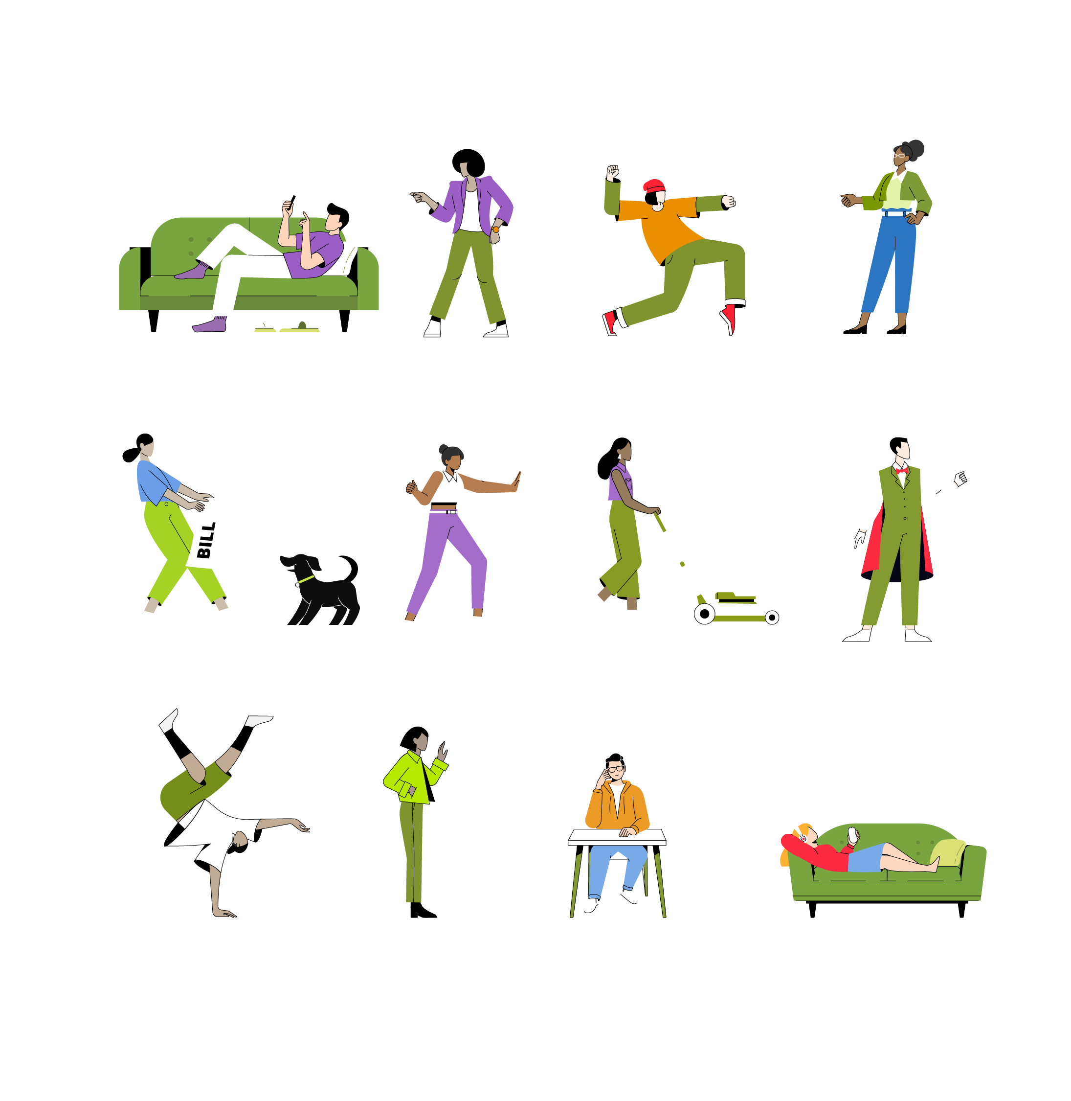 Bold, bright 2D characters and geometric shapes create a consistent look across spots.